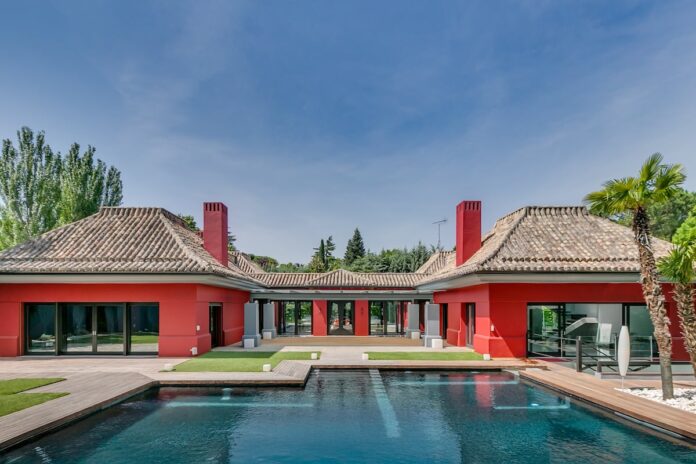 Una arquitectura distintiva, en forma de pagoda y con guiños al mundo asiático, marca el diseño de esta villa, emplazada en la urbanización de lujo madrileña de La Moraleja. La vivienda cuenta con una superficie construida de 1.000 metros cuadrados que se distribuyen en espacios amplios y dos niveles.