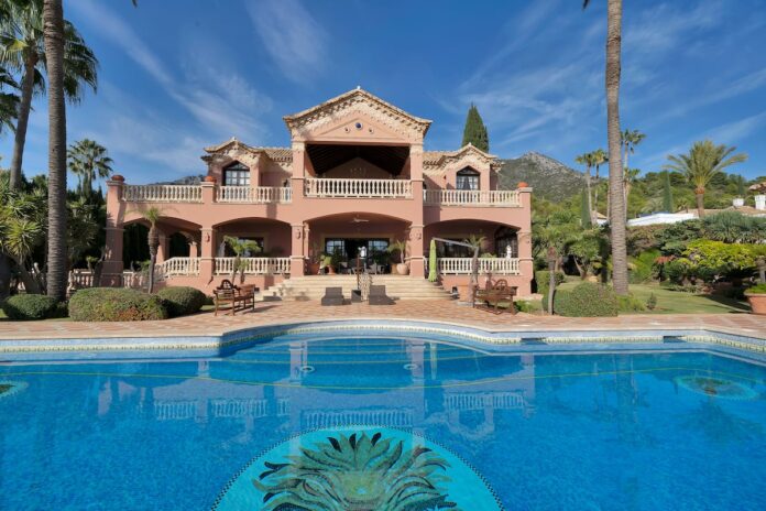 El exterior, dicen fuentes de Re/Max, cuenta con huerto de naranjos, fuentes y una piscina climatizada, flanqueada por un pabellón con cocina de verano y comedor.